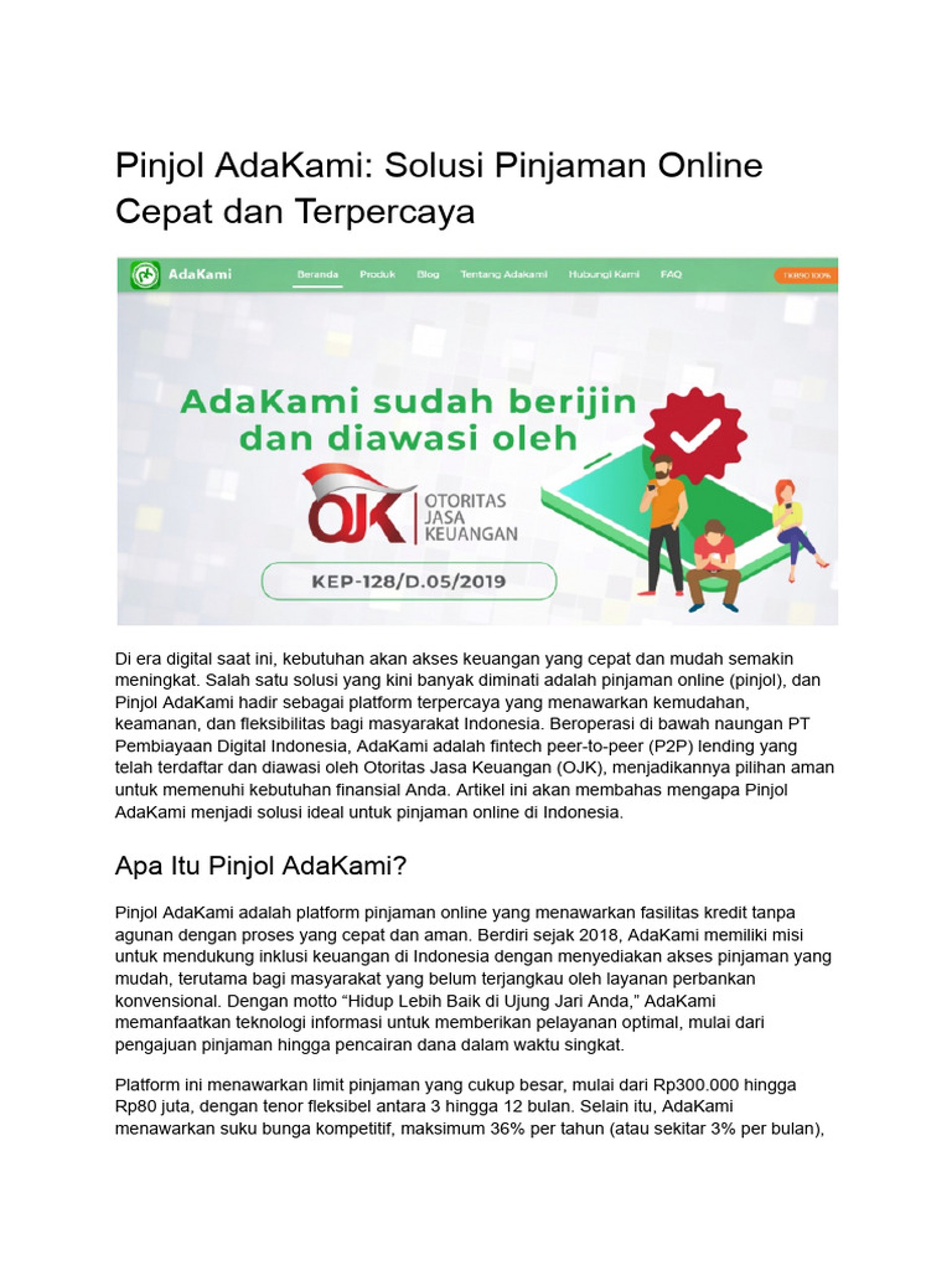 AdaKami adalah sebuah platform peer-to-peer lending online lokal yang menyediakan fasilitas pinjaman (kredit) tanpa agunan. Semangat kami adalah untuk membangun akses keuangan yang berkualitas bagi ratusan juta orang Indonesia. Kami berkomitmen untuk membantu orang-orang serta komunitas dalam meraih mimpi mereka dalam setiap tahapan hidup mereka.